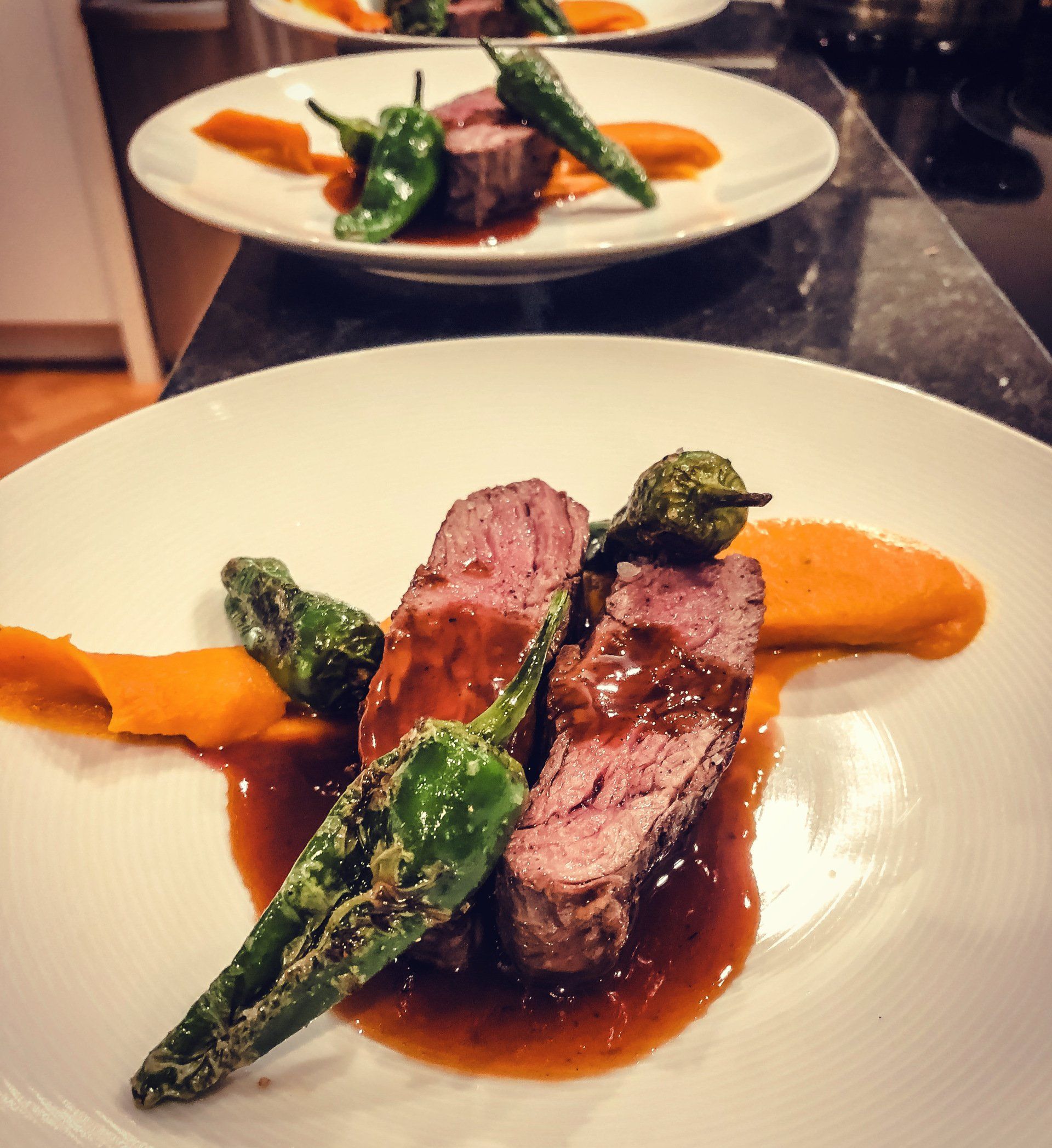 Süßkartoffelpüree, Piementos de Padrón, Five Spice Jus